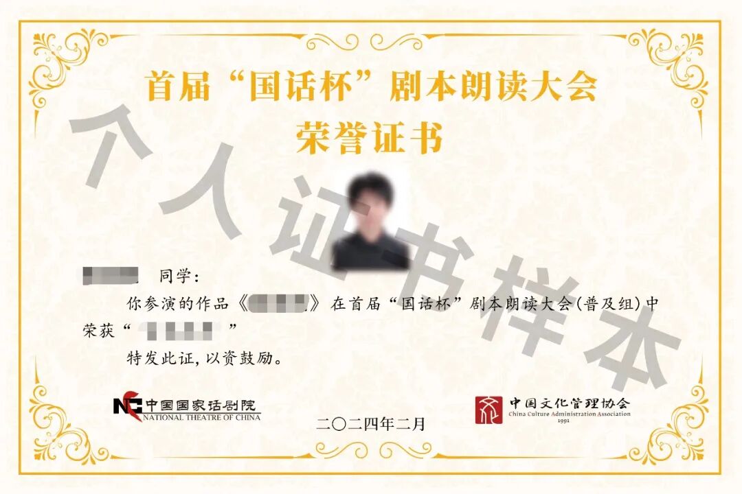 参加展演活动的个人、团体、单位均可获得由中国国家话剧院、中国文化管理协会联合颁发的新时代青少年艺术普及活动——首届“国话杯”剧本朗读大会参演荣誉证书和国话杯。